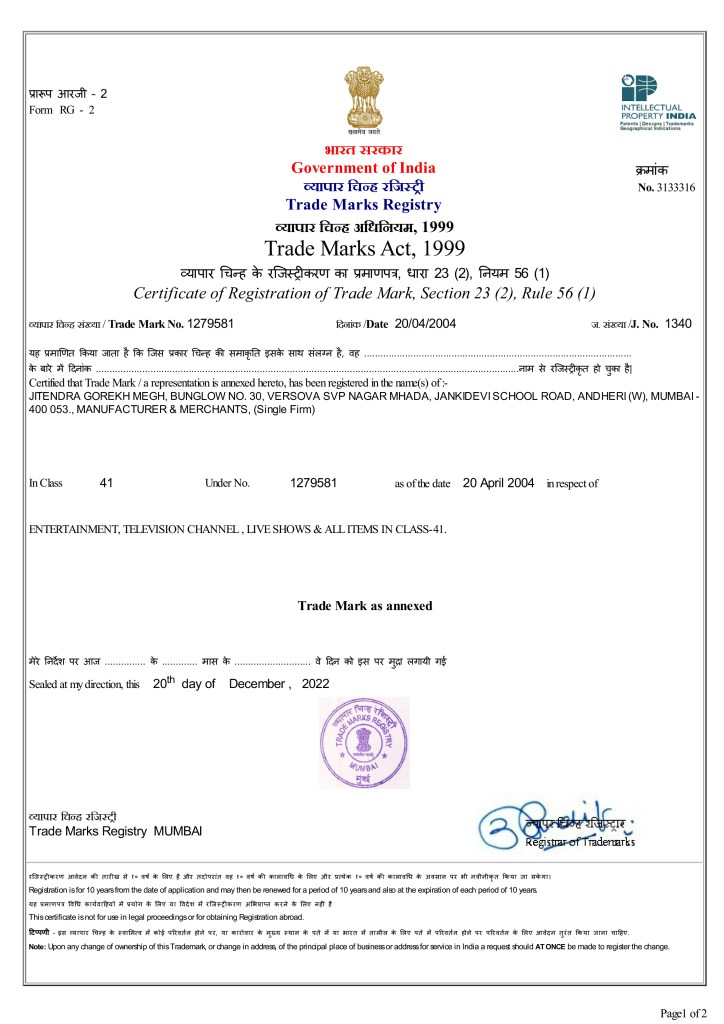 FTVWORLD.COM is a registered trademark under class 41 of the Trade Marks Act, 1999, Government of India, by proprietor Jitendra Gorekh Megh